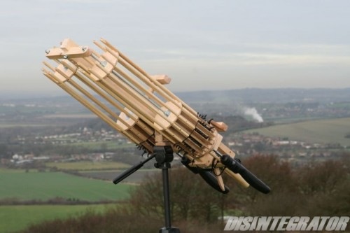 Terrorise your workmates with a Disintegrator rubber band gun. The DISINTEGRATOR is the most incredible rubber band gun ever built, capable of firing more than 40 rounds per second (2400 rounds per minute) from its 24 revolving barrels.