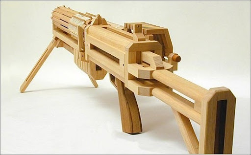 This beauty is a fully funcitonal machine gun with TWELVE rotating barrels and a live action trigger. Loads 12 bands per barrel for a whopping 144 rubber bands that shoot off as fast as you can turn the handle! Great fun for kids of all ages. MORE than just an amazing machine, this is a true work of art.