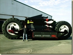 The super-heavy 10-foot tall motorbike can crush cars in first gear, though it has a 6-speed Allison automatic borrowed from a prime mover,powered by a "Detroit Diesel engine, just in case you need to clock up some highway kilometers.